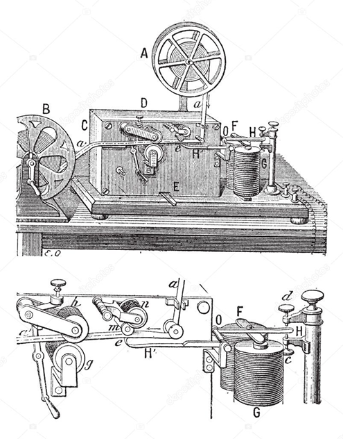 - Un électroaimant (souvent avec 2 bobines en série) attire une plaque de fer solidaire d’un levier supportant un instrument scripteur traçant les signes sur la bande.