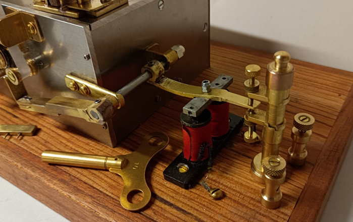 A droite une tige de laiton plat est fixée à un pivot qui relève le stylet scripteur qui met en contact le papier et la roue encrée. La course de cette tige est limitée dans les deux sens par des vis de réglage montées sur une colonnette, tout à droite. La palette de fer doit être à bonne distance : trop éloignée et elle n’est pas attirée, trop près et elle reste collée en raison d’une magnétisation rémanente du fer qui n’est pas absolument pur. La force d’attraction doit être assez puissante pour que le stylet appuie fortement sur la bande.