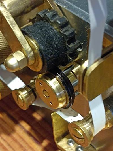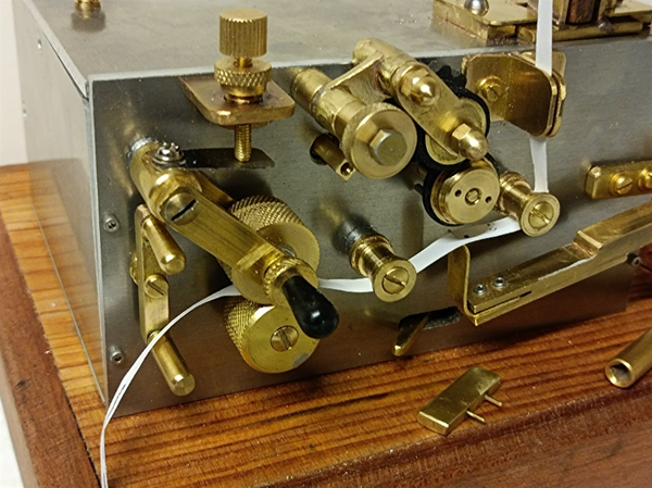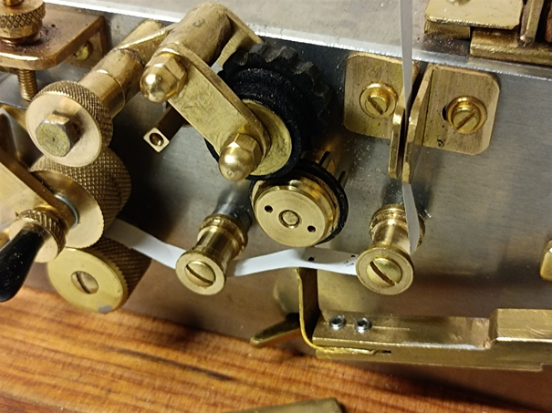 La photo permet de voir la bande guidée par les galets qui passe entre le stylet et la roue d’encrage. Lorsque l’électro-aimant est activé, le stylet est basculé vers le haut et met la bande en contact avec la roue. En fonction de la durée de contact des points et des traits sont inscrits sur la bande de papier.