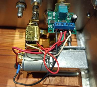 L’électro-aimant a été récupéré sur un ancien timbre de porte d’entrée, une « sonnette ». Son alimentation électrique est de 6 volts continus avec un courant avoisinant les 2 ampères. Il faut en même temps récupérer la palette en fer qui est attirée lorsque le circuit est établi.